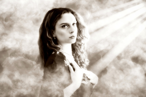 A 1915 style photograph: Mademoiselle Renée Valois is rendered in the soft, smokey tonal depth characteristic of the period’s portrait studios. The gentle sepia warmth and subdued atmosphere lend her presence a quiet dignity, preserving her likeness with the understated elegance of early twentieth century vintage photography. The enveloping clouds and drifting smoke echo the soft focus aesthetic favoured by artists of the 1910s, a technique embraced by photographers such as Edward Steichen and Baron Adolf de Meyer to elevate their subjects into mythic, goddess like figures. The sepia tonality completes the illusion, imparting an Old World luxury that defines the era’s most evocative portraiture.