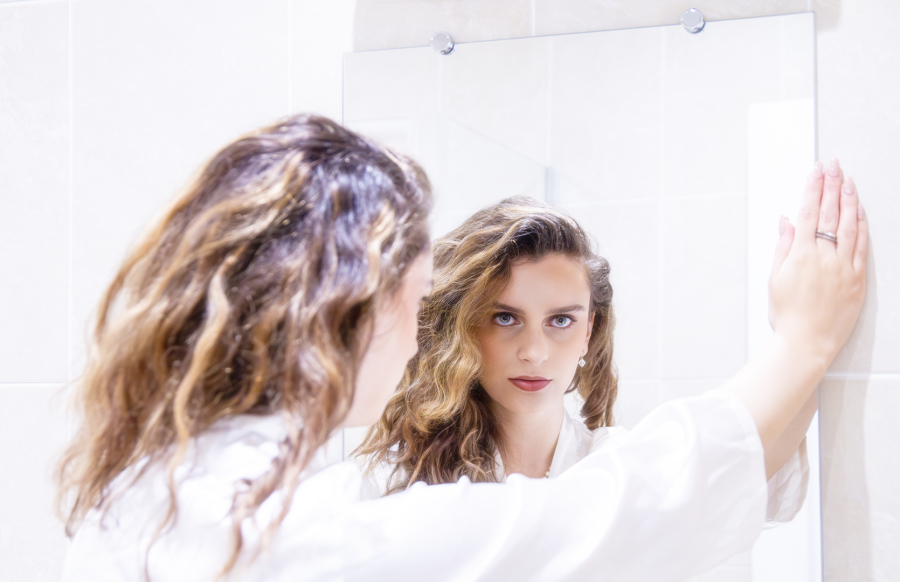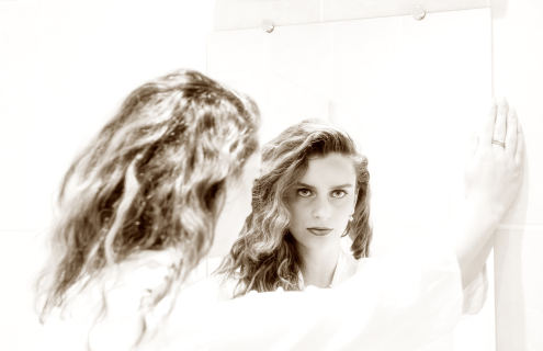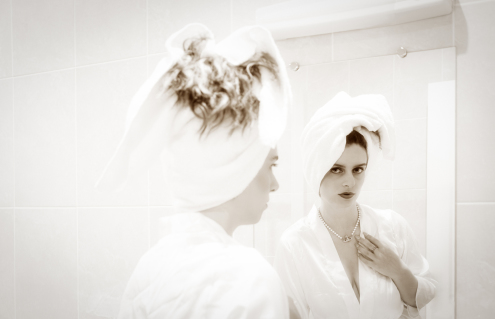 between the soft tactility of the foreground and the poised, sophisticated gaze Kiki casts into the mirror.