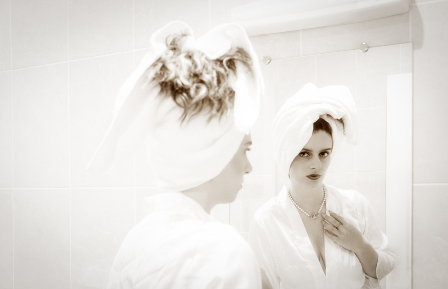 of her en suite in Room 101 at the Hotel Adlon, Berlin, Autumn 1920. The composition embraces a daring white‑on‑white aesthetic, setting the dense textures of towel and silk robe