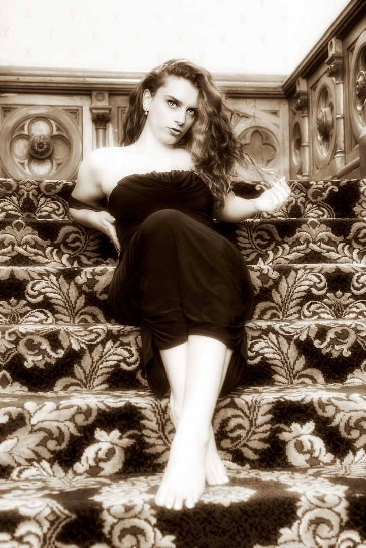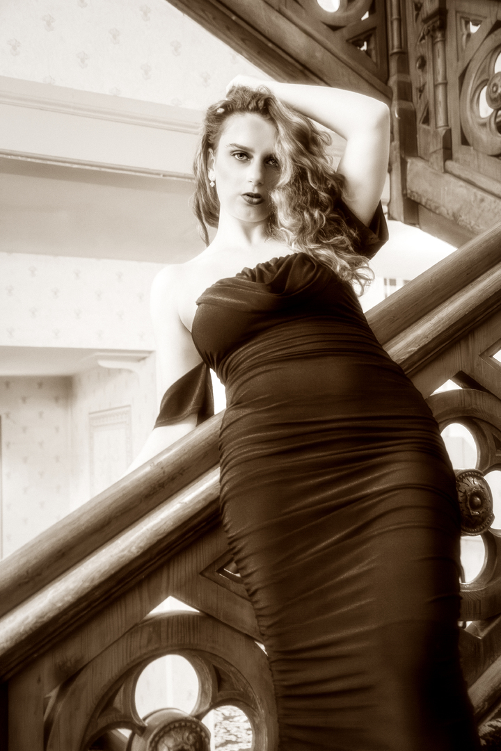 Her seductive pose on the staircase echoes the era’s fascination with theatrical glamour and sculpted light.