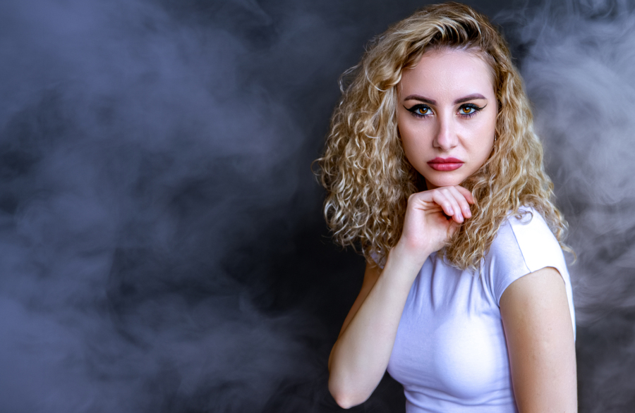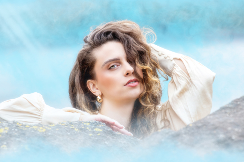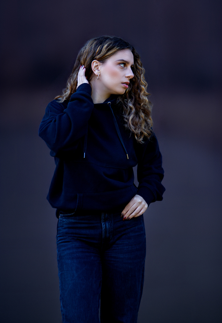 Moody Portrait with Dramatic Lighting: A portrait study using dramatic lighting to highlight facial features and hair texture against a blurred background. The subject’s pose - hand raised to the hair, gaze turned aside creates intimacy and focus